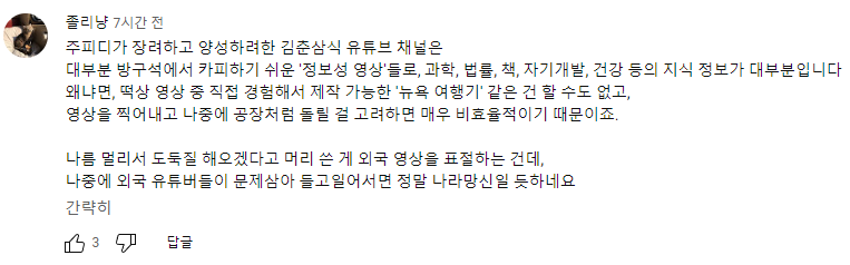 글과 달리 유튜브는 영상 편집 노력이 어려워서 표절 논란에서 자유로웠는데 지금은 인공지능이 많은 일을 하고 있고 유튜브도 고생하는 느낌이다. 표절 콘텐츠를 보면 정보를 다루는 동시에 유튜버에게 힘을 주는 정보 채널이다. 아래 댓글이 그 이유를 설명합니다.