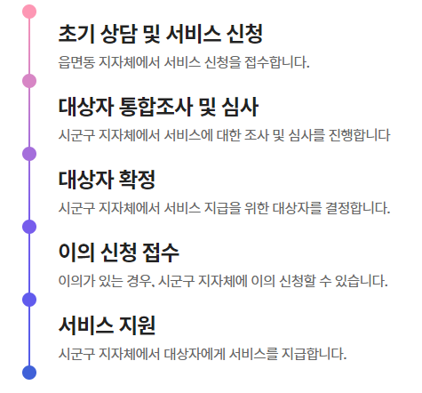 청년 임시임대차 특별지원 처리 절차는 초기 상담 및 급여 신청 → 대상자 통합 결정 및 평가 → 대상자 본인 약정 → 이의 접수 → 서비스 지원 순으로 진행됩니다. 읍·면·동 지자체는 서비스 신청을 받고, 시·군·구 지자체는 대상자를 대상으로 설문조사 및 심사를 거쳐 서비스 지급 대상자를 결정한다. 이의를 제기하는 경우 지자체에 이의를 제기할 수 있으며 대상자에게 서비스가 제공됩니다.