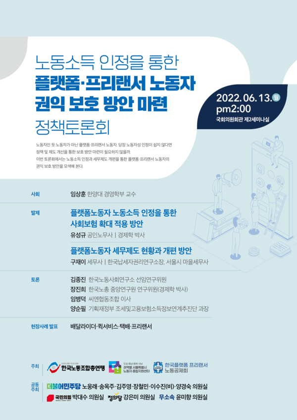 “지키지 못할 작품은 없다”…프리랜서를 위한 협업의 울타리! ‘근로자 시민권’ 논란 프리랜서·플랫폼 근로자 82% ‘코로나19로 소득 손실 경험’ 고용보험 가입자 23% 잔류했지만 근로자 신분 미지급, 안전망 배제’ 근로자 스스로 협동조합 설립 .문화예술의 거리인 대학로에 처음 발을 디뎠을 때 ‘좋아하는 일을 하며 행복한 삶을 살 수 있다’고 생각했지만, 젊은 프리랜서 예술가들이 마주한 현실은 녹록지 않았다. 그리고 생계를 유지하기 위해 여기저기서 일하는 TV 촬영 감독이 직업이 없거나 가족이 많은 돈을 벌고 있을 때 그는 자신의 궁지에 몰리고 있습니다. 나 자신을 보호하기 위한 좋은 은행 잔고. 이런 종류의 불안은 그를 “일 지옥”으로 더 몰아넣었습니다. 3-4시간의 낮잠이 하루의 순서였기 때문에 컴퓨터 앞에는 카페인이 든 음료수 병이 쌓여 있었습니다. 붉은 깃발이 올라갔습니다. 건강면에서도요. 업무에 차질이 생길까 봐 몸이 아픈데도 일을 하러 갔습니다. 일을 주는 고객에게 프리랜서는 언제든 대체품일 뿐입니다. “, “내 삶을 더 좋게 만드는 것”‘. 11년 경력의 프리랜서 아티스트 안창용의 이야기다. 미친놈”이라고 말했다. 그는 자신의 삶을 “특별할 것도 없고, 많은 프리랜서들 사이에서 흔히 볼 수 있는 이야기”라고 표현해 한국에서 ‘비정규직 노동자’로 살기가 얼마나 힘든지 여실히 드러냈다. 자유협동조합 회장인 그는 지난 3월 11일 전국노총 대회의실에서 열린 ‘자유협동조합 활성화를 위한 세미나’에서 연사로 나선 바 있다. 인식되지 않습니다. 무급 프리랜서들이 자율적인 노동을 통해 협동적으로 수익을 창출하고 사회안전망 안에서 일할 수 있도록 돕고 싶습니다. 토론회는 ‘코로나19 위기시대 노동자의 시민권’을 주제로 김영배·민형배·이수진(비례대표) 공동의장, 위원장은 더불어민주당 안 의원실, 근로인민협동조합, 한겨레경제사회연구원 등이 전하는 프리랜서 업무의 현실은 구체적인 수치로도 확인된다. 프리랜서근로자협동조합협의회’가 지난해 10월 말부터 올해 1월 중순까지 근로자 실태조사를 실시했다. 이번 조사에서 프리랜서, 가사노동자, 대리운전기사를 대상으로 전체 응답자의 82.1%가 소득이 줄었다고 답했다. 김 연구원은 발표에서 “지난해 의 또 다른 조사에서는 정규직의 19.2%만이 코로나19로 인해 소득이 줄었다고 응답했는데 이는 엄청난 차이이다. 응답자의 41.3%가 소득이 40% 이상 줄었다고 답했으며, 소득 감소로 부족한 생활비를 메울 수 있는 방법을 묻는 질문에 응답자의 25.1%가 ‘적금을 사용한다’고 답했다. 응답자의 12.7%가 다른 방법은 없다.그래도 28.7%만이 정부의 고용 안정 보조금을 받았다.김씨는 “플랫폼과 프리랜서의 특성상 소득 감소를 입증하기 어렵기 때문에 많은 노동자들이 지원을 받지 못하는 것 같다”고 말했다. 설명했다. “고용보험 가입은 23.2%, 산재보험 가입은 15.5%에 불과합니다. 그렇다면 협동조합은 어떻게 이러한 불안정한 노동력 문제를 해결할 수 있을까요? 안창룡 회장은 프리랜서 협동조합이 제공할 수 있는 사회안전망△ 노동조합 및 프리랜서 사용자가 고용계약을 체결하고 4대 보험 적용 △대행계약 및 회계업무 △법인종합계약을 통한 중개 착취를 통한 하도급 구조 개선 △노무사·변호사 공동채용으로 법적 분쟁 대응 그는 “관련 법률이 없기 때문에 근로자를 무시해서는 안 된다. 샐러리맨들이 누리는 사회보장제도가 생겨서 프리랜서도 누릴 수 있었으면 좋겠습니다. 김활신 연구원은 “플랫폼과 프리랜서의 불안정성을 해결하는 것은 우리 커뮤니티의 미래 세대를 위해 안전하고 적절한 일”이라고 말했다. 기조연설자 박명준 한국노동연구원 연구원은 ‘한계노동’과 ‘사회시민’이라는 개념으로 해법을 모색한다. 프리랜서, 특수고용직 등이 대표적 ‘사회적 시민’은 모두가 안전한 삶을 누리며 인간다운 삶을 누릴 자격이 있다 다양한 사회적 위험에 대한 안전망은 사회 인프라 차원에서 마련돼야 한다. 새로운 자유와 함께 이념의 대두와 함께 사회적 시민권을 박탈당한 소외된 노동자들이 확산되고 있다는 점이다. 토론자로 참여한 황순자 민주노총 중앙연구원 부원장은 “협동조합과 노동조합은 한 가지 공통점: 사회구성원들이 집단적으로 사회에 개입하는 전략. 자본주의가 제기하는 위험. ” 이종규 하니경제사회연구소 연구원 [email protected], 한겨레신문, 2021-03-16